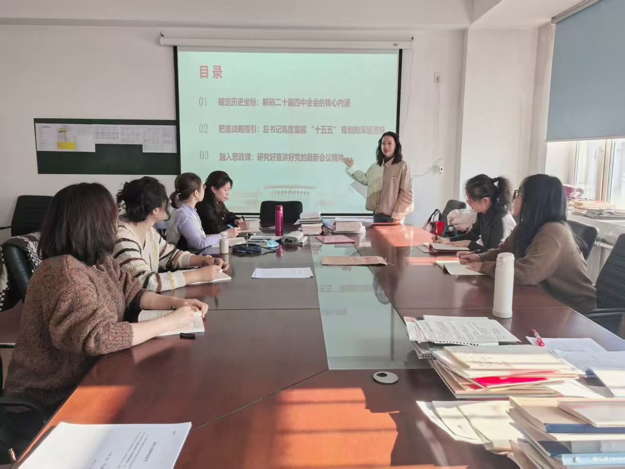党支部朱文艾书记从锚定历史坐标:解码二十届四中全会的核心内涵、把握战略指引:总书记高度重视 “十五五” 规划的深层逻辑和融入思政课:研究好宣讲好党的最新会议精神三个方面对二十届四中全会精神深入剖析。党的二十届四中全会对推进中国式现代化作出重要部署,其中关于建设更高水平健康中国的要求,为卫生职业教育工作指明了方向。